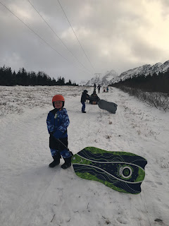Once we got some daylight, Dad dropped us off at Glen Alps with sleds and we took the kids on a 5 mile adventure sled. We sledded down the powerline and were picked up at Hilltop Downhill ski area.